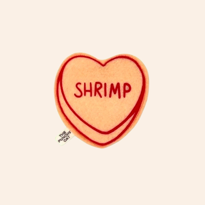 The classic conversation heart candy with a feline twist. This super potent cat toy is handmade with 2 layers of wool felt, stuffed with organic catnip, and screen printed with a red “SHRIMP” candy heart design.