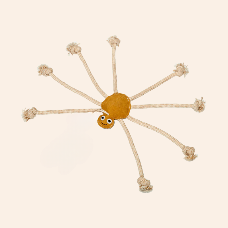 Made from a suede outer with natural jute fibre stuffing and plaited, jute rope legs that go on and on, Lily will go to great lengths to keep your dog entertained. Tough and long lasting, made without using any compound that would harm or be released when chewed.
