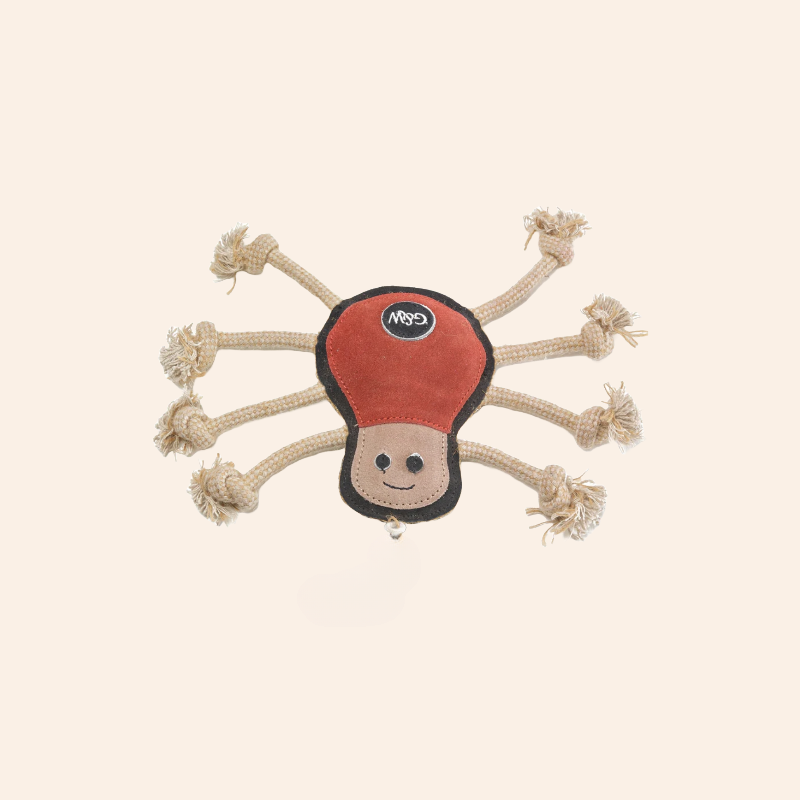 Spike the Spider has a suede outer layer covering a filling of natural jute fibres and eight, natural jute rope legs. Tough and long lasting, made without using any compound that would harm or be released when chewed.