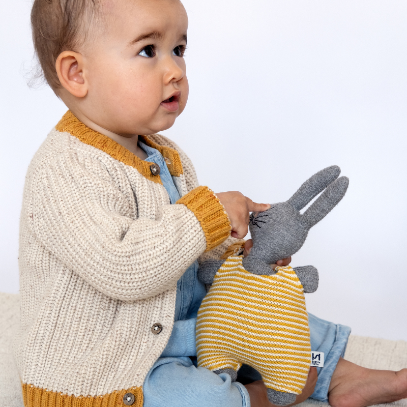 A modern soft toy dog in cotton knit, featuring a striped yellow romper and a softly weighted bean-filled body.