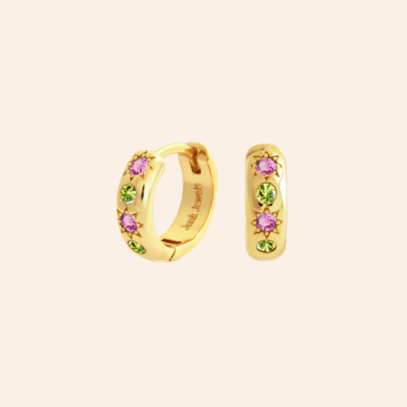 There’s no sugar-coating needed for these embellished beauties. The chubby hoops are encrusted with pink and green gemstones like coloured candies. The petite sizing of these hoops makes them a perfect new addition to your ear stack. Stack them high or wear them alone, either way, they’ll be the icing on the cake.