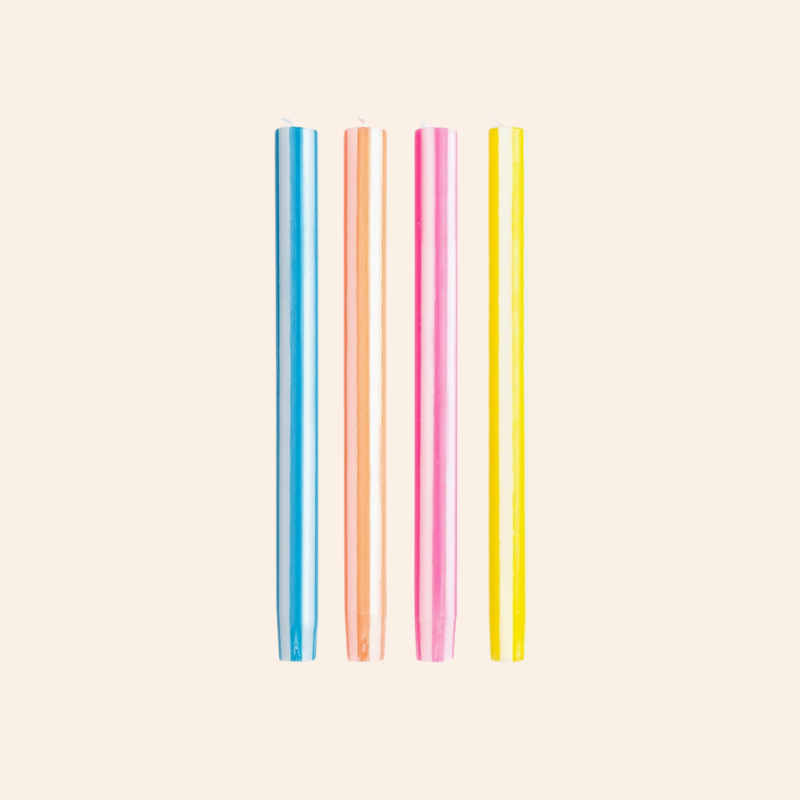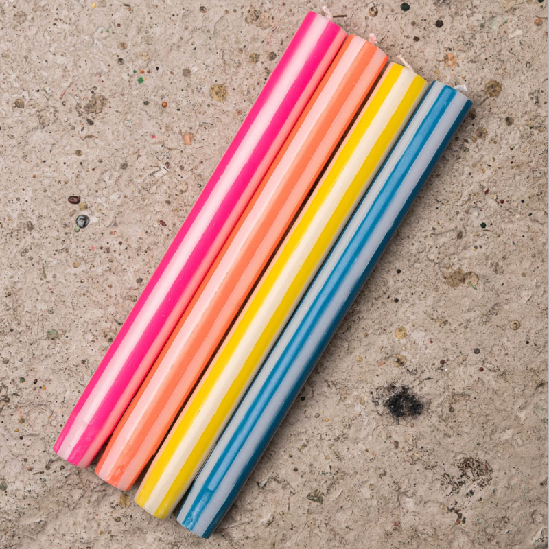 Elevate your dining table with these Striped Dinner Candles. These hand-poured candles are Fair trade and made from 100% Stearin Wax.