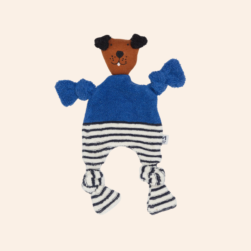 A contemporary cotton knit baby comforter with soft terry body and an embroidered dog face. Lightweight, tactile and easy for little hands to grasp - perfect for newborn gifting and everyday use.